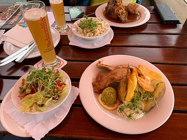 下山後開始找尋餐廳!後來找了一家位在橋邊鄰近內卡河邊的啤酒餐廳,點了一杯Weißbier 和特餐(便宜又好吃),不過不建議再額外加點沙拉(通常服務員會直接問你要沙拉嗎?要直接說不用不然以亞洲人的胃肯定吃不完)但是我們以為是附加的所以就不小心點了。但總體而言很好吃,馬鈴薯搭配獨特醬汁別有一番風味!