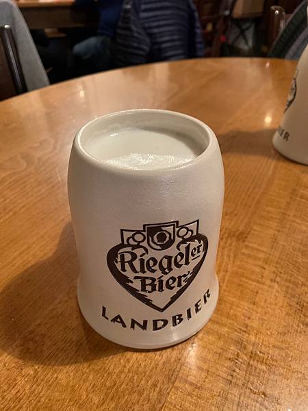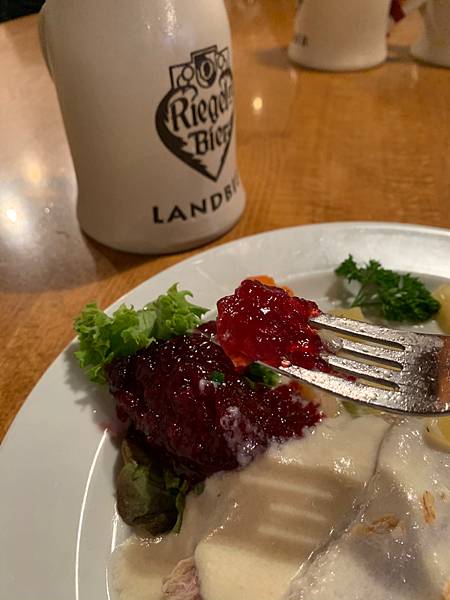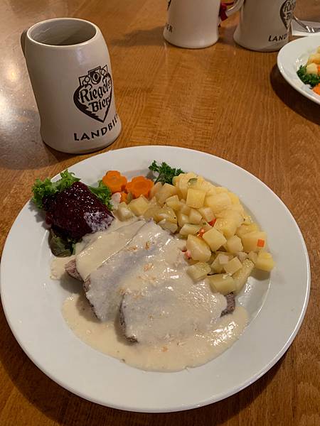 來訪這家餐廳之前有事先做好功課要點什麼餐點。這次我點的是Badisches Ochsenfleish mit Meerrettichsauce清燉牛膝蓋肉(小份)和Land Bier 鄉村啤酒(0.5l)